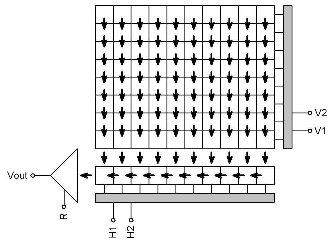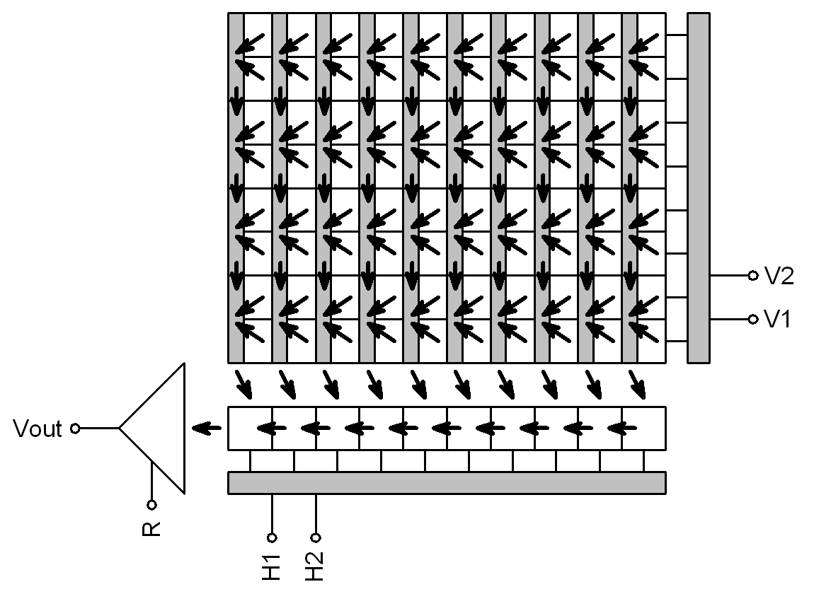 Schéma FF čipu (počet vertikálních a horizontálních elektrod se liší v závislosti na architektuře čipu)