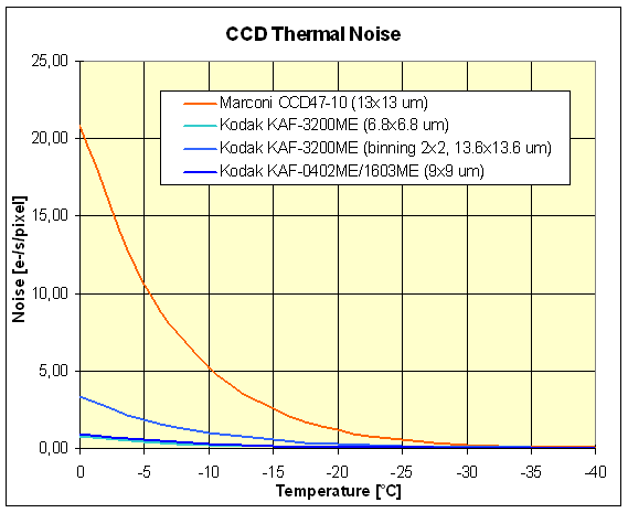 Typický temný proud (v e-/s/pixel) pro zezadu osvětlovaný Marconi CCD47-10 a zepředu osvětlovaný Kodak KAF-3200ME a KAF-1603ME
