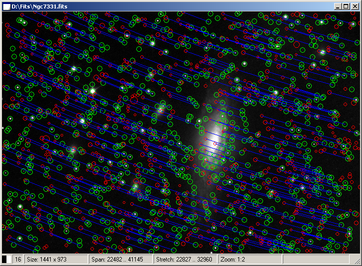 matching catalog stars (red circles) and blue lines showing