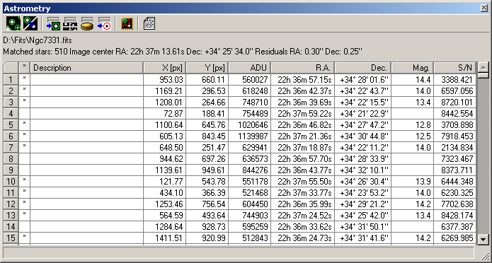 Astrometry tools displays a table of all stars found on the