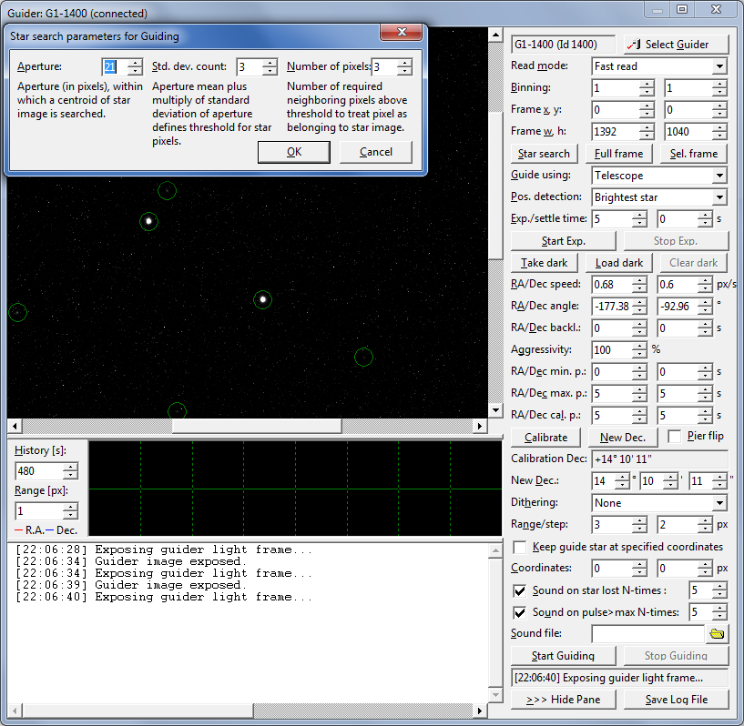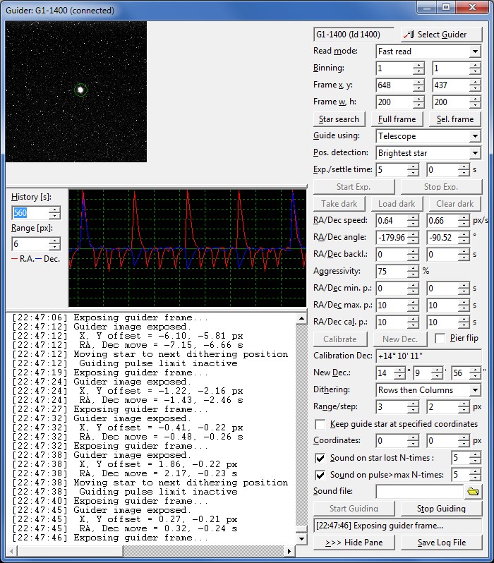 as well as panes displaying guiding camera image, history charts