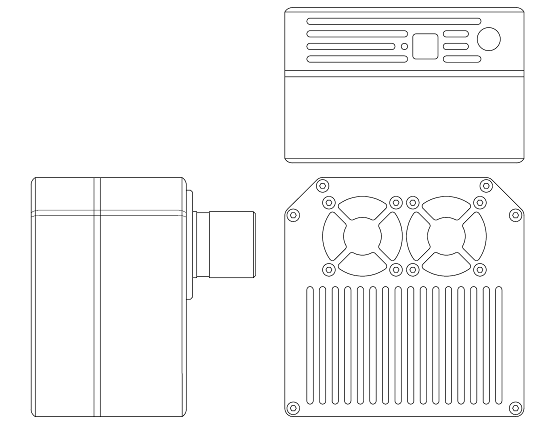 Integrated blade shutter and filter wheel (left) Custom CNC-machined cooler with two high-efficient fans (right)