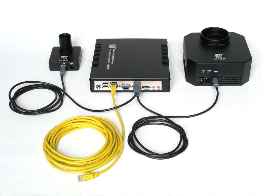 Optional accessoriesCamera head can be combined with various accessories according to the requirements of the target application (optical system, used filters, guiding, etc.). Telescope adaptersLarge diagonal dimension of CCD detectors used in G4 cameras (52 mm) does not allow usage of common adapters, typically limited to 2 inches diameter (50.8 mm), like T-thread M42 × 0.75, M48 × 1 thread, Nikon bayonet etc. This is why G4 cameras are by default shipped with M68 × 1 threaded adapter. Another alternative if Canon EOS photographic lens adapter, which has enough diameter not to cause significant vignetting. Adapter is designed for G4 cameras with external filter wheel, with which it keep the 44 mm back focal distance between bayonet front plate and CCD detector.